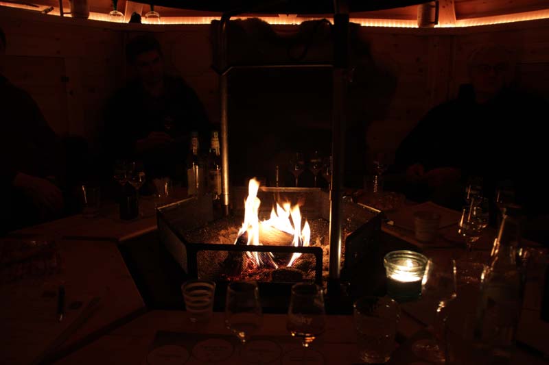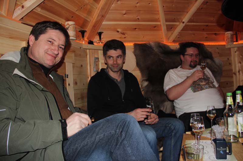 Das Ambiente in einer Grillhütte am Feuer, auf Fellen sitzend, war sehr ansprechend und gemütlich, sodass wir gar nicht merkten, wie die Zeit vergeht. Die Whiskys an diesem Abend kamen durchweg sehr gut an, wobei der Highland Park 12 von The Maltman, sowie der Dalmore 15 von Gordon&McPhail einen kleinen Vorsprung erzielten. Der Rauch unseres Feuers störte das Testen eher nicht. So zumindest unser Eindruck. Es war lediglich zu wenig Licht, um die Farben der Whiskys klar zu definieren... ;-)